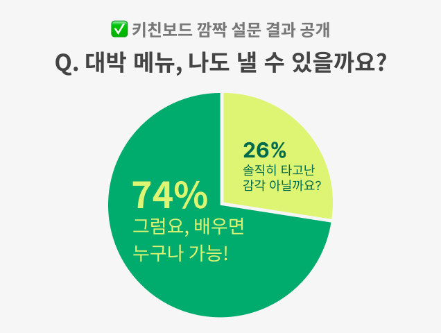 ✅ 74%의 사장님이 타고난 감각 없이도 배우기만 한다면 누구나 대박 메뉴를 낼 수 있다고 응답해주셨어요. 배움을 멈추지 않고 정진한다면 우리 가게 매출도 그만큼 올라갈 수 있을거예요!