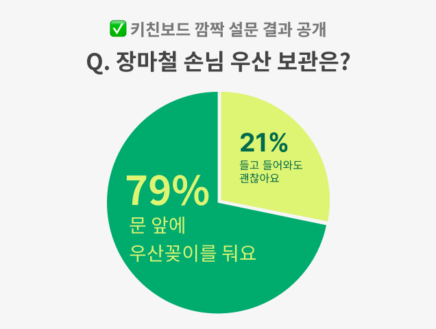 ✅ 79%의 사장님들이 장마철 손님 우산 보관을 '문 앞에 우산꽂이를 둬요' 라고 대답해 주셨네요. 우산 보관이 편하고 매장 바닥에 빗물이 떨어져 미끄럼 사고를 방지하기에 좋죠! 곧 다가오는 장마철, 사장님들 모두 안전하게 운영하세요 :)