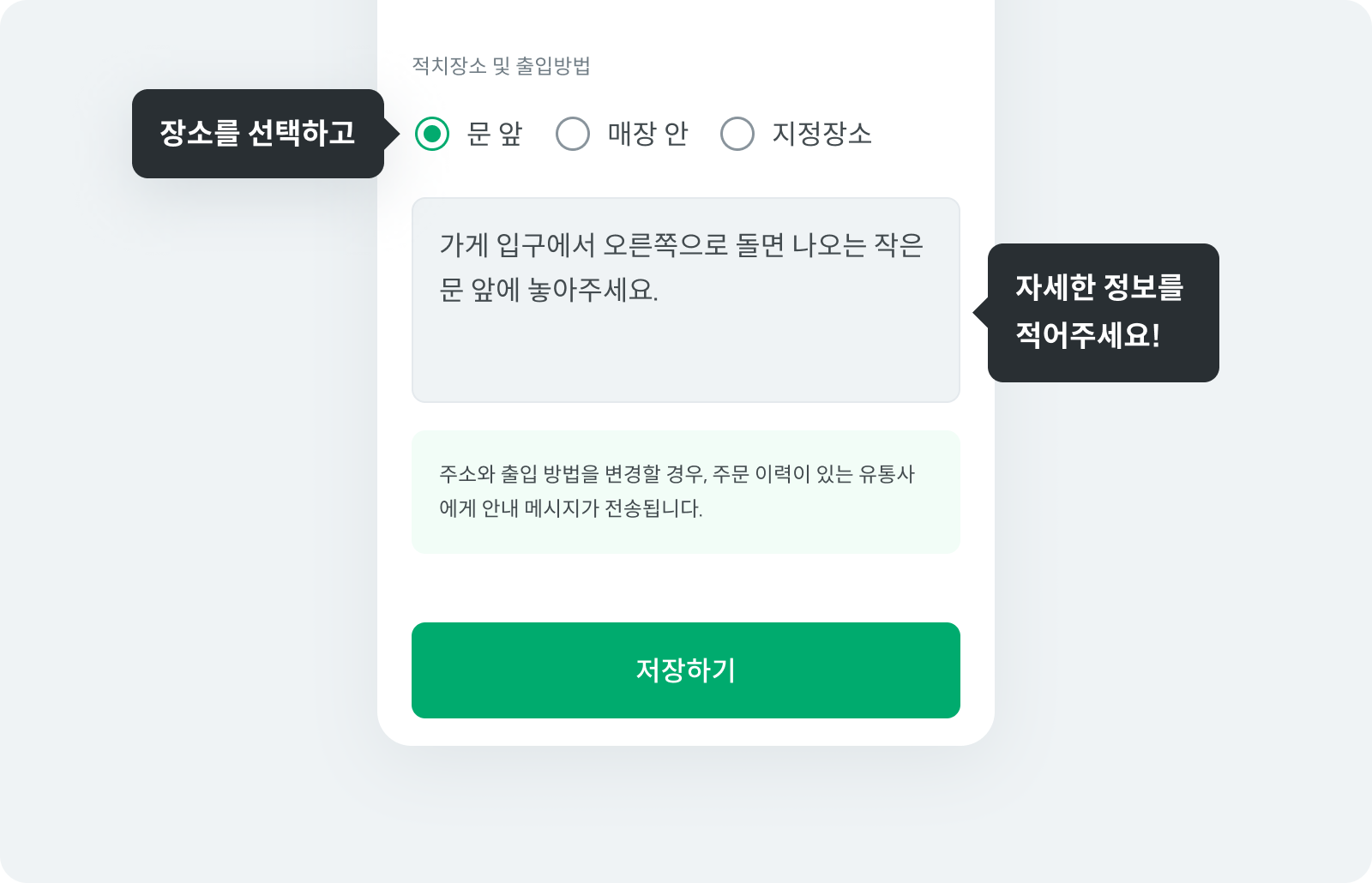 예) 주방 냉장고 중 오른쪽 냉장고 하단에 넣어주세요. (비밀번호 *1234*)