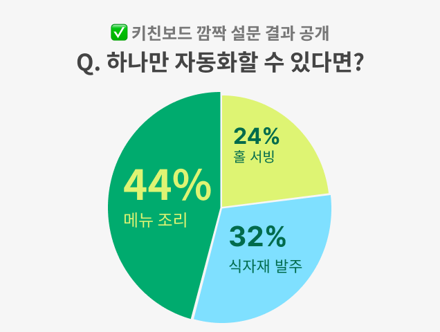 ✅ 44%의 사장님들이 메뉴 조리를 자동화하고 싶다고 답해주셨네요. 우리 식당의 음식을 일정한 맛으로 제공하고픈 사장님들의 마음이 담긴 결과라고 생각합니다! 그리고 식자재 발주 자동화를 원하는 사장님도 32%나 계시는데요. 키친보드가 사장님들의 바램을 조금이나마 해결해 드리고 있다면 좋겠네요 :)