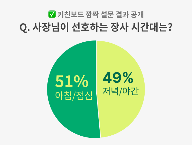 ✅ 51% 사장님들께서 선호하는 장사 시간대가 아침/점심이라고 답해주셨네요! 바쁜 하루를 활기차게 시작할 수 있는 이른 시간대를 선택하신 것 같아요. 49% 사장님들은 저녁/야간이라고 답해주셨는데요. 하루의 마무리 식사 시간을 즐기러 오는 손님을 만나는 시간 역시 매력적인 시간대인 것 같아요. 이번 설문조사의 답변이 거의 팽팽하게 나뉜 만큼, 각자의 방식으로 손님을 맞이하고 계시다는 걸 알 수 있었습니다.