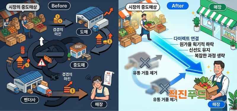 A. 생산자 혹은 중도매상과의 다이렉트 거래를 통해 유통 거품을 제거하는 것입니다. 직진푸드는 도매사와 벤더사를 거치는 불필요한 단계를 없애고, 시장 중도매상과 매장을 직접 연결합니다. 이를 통해 원가율을 낮추고 치열한 상권에서도 안정적인 수익을 창출할 수 있는 구조를 만듭니다.