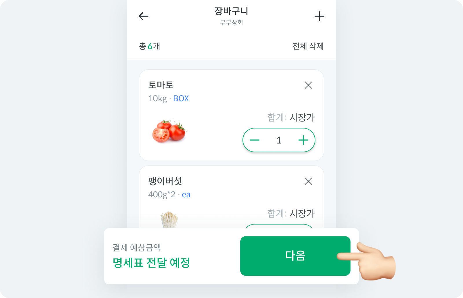 담은 품목이 맞다면, '다음' 버튼을 눌러주세요.