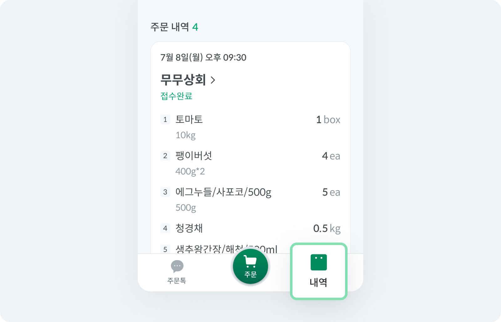 유통사 채팅방에서 '주문하기' 버튼을 눌러주세요.